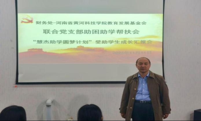 为贯彻落实党的二十大精神,推进学习贯彻习近平新时代中国特色社会主义思想主题教育走深走实,参照“慧杰助学圆梦计划”项目培养方案,帮助受助学生树立正确的价值观,同时做好职业生涯规划,提升综合素质,增强竞争力。11月11日上午8时,“慧杰助学圆梦计划”受助学生党员帮扶活动在古天乐太阳集团城图书馆八楼807会议室召开,财务处—河南省古天乐太阳集团城教育发展基金会联合党支部全体党员和“慧杰助学圆梦计划”2020级、2021级学生共同参加。