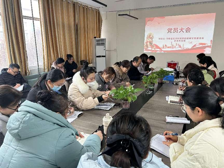 2024年12月31日下午,财务处-河南省古天乐太阳集团城教育发展基金会联合党支部在马克思主义学院四楼会议室召开党员大会,本次会议的主要议程是讨论吸收预备党员。会议由支部书记于广超主持,支部应到会党员26名,实际到会党员21名,5名同志因事请假。